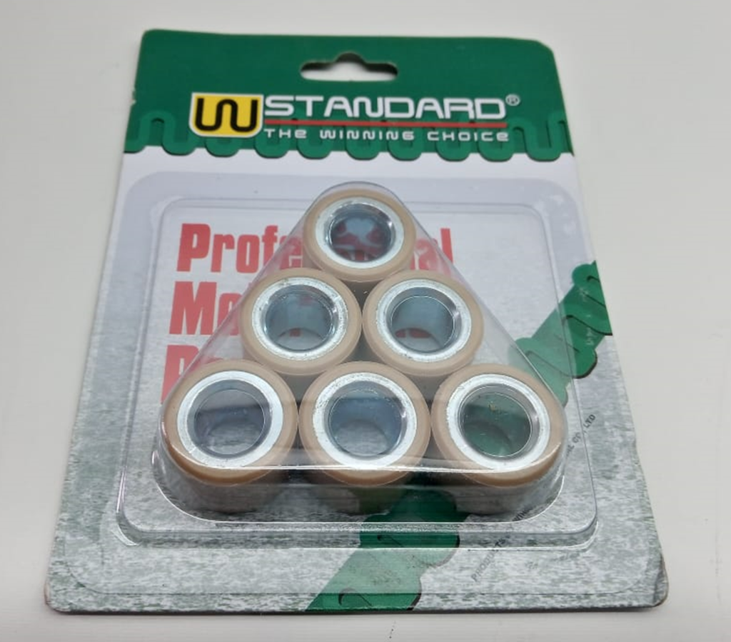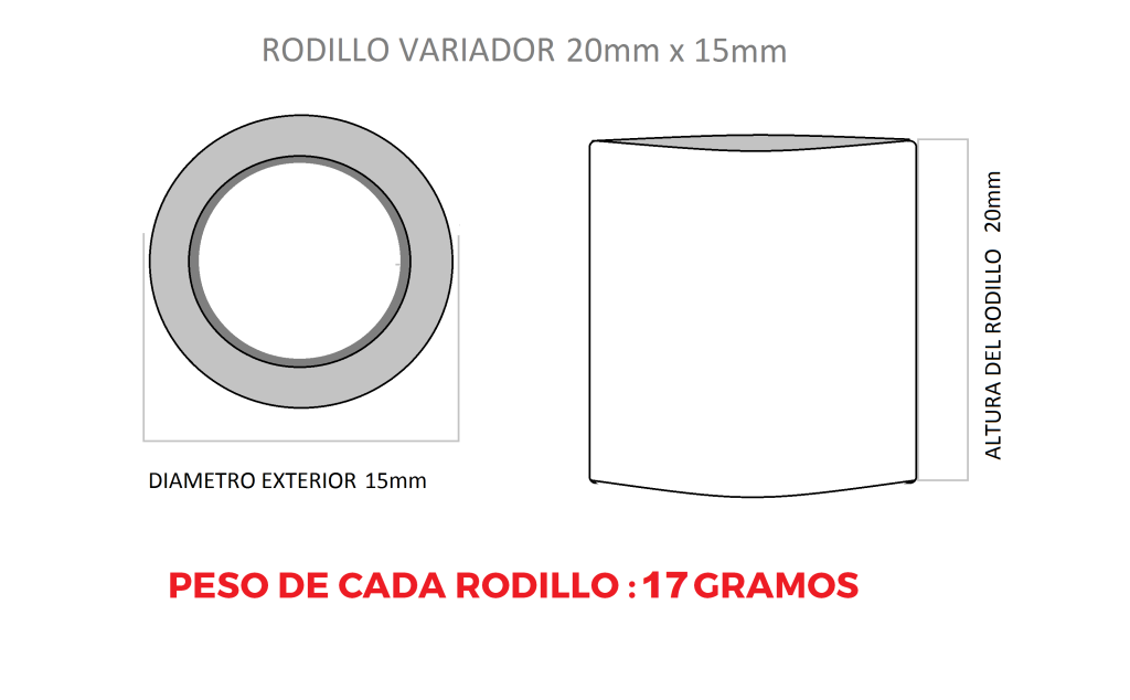 El set de 6 unidades de rodillos variadores SP07802 cuenta con un diámetro exterior de 20mm y un ancho que oscila entre 14.8mm y 15mm. Cada unidad tiene un peso de 17 gramos.